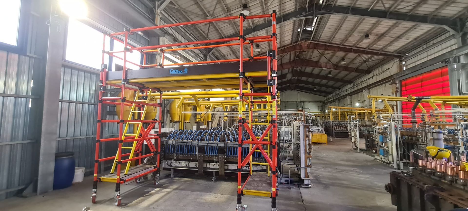 A red scaffolding is in a large room with a chandelier hanging from the ceiling.
